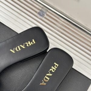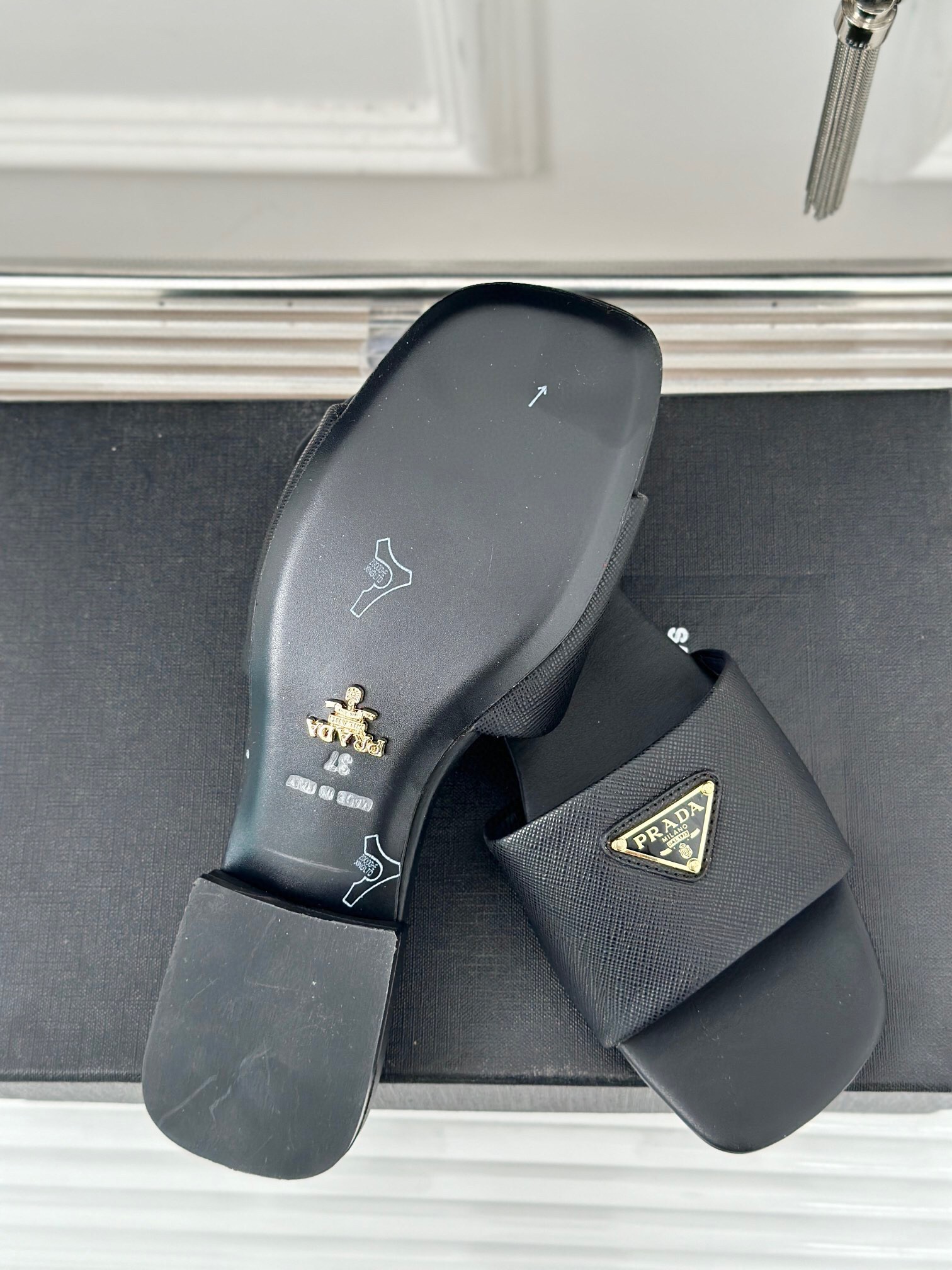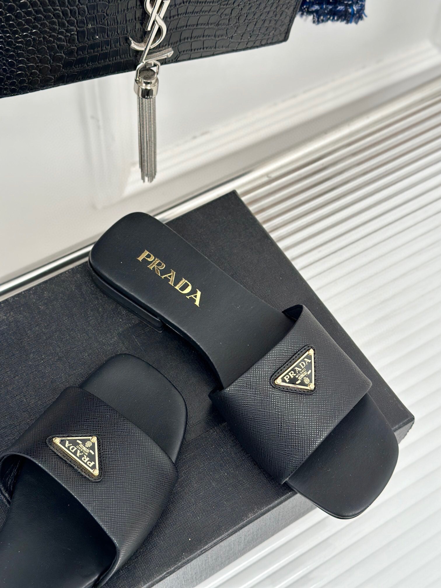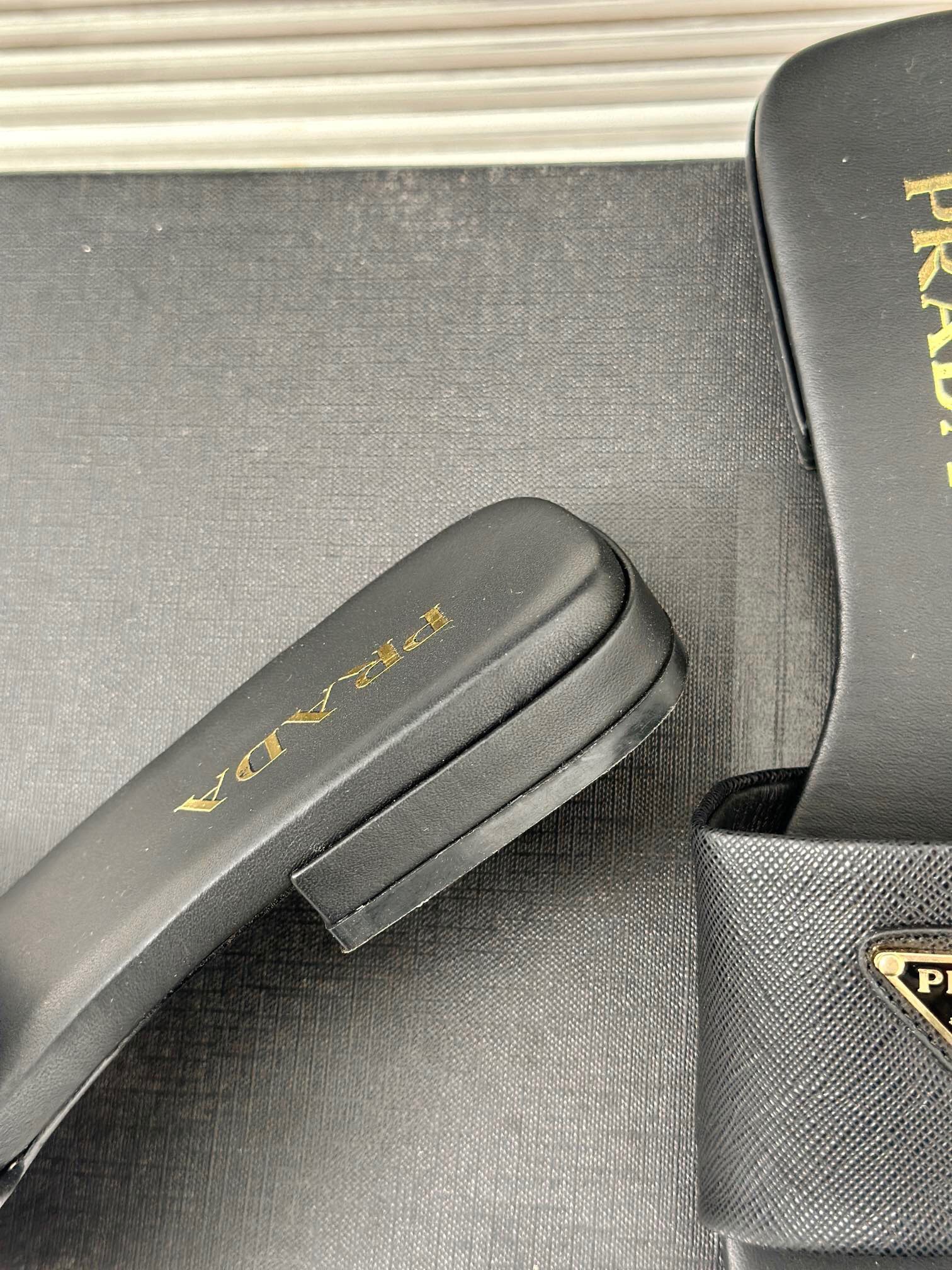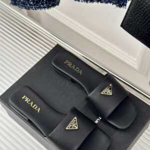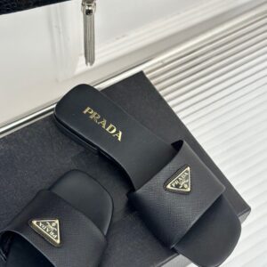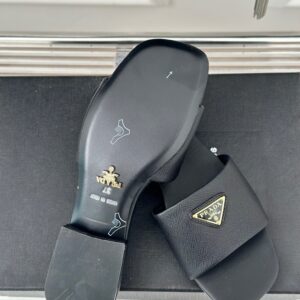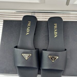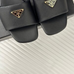 The distinctive crosshatch pattern of Saffiano leather, a signature material of Prada collections, meets the Saffiano leather in these slides with a contemporary design. The sophisticated and versatile style defined by clean, sleek lines is enriched with the iconic enameled metal triangle logo.