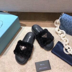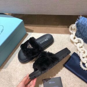 For a cosy poolside aesthetic, opt for Prada’s black slides. Made in Italy with quilted shearling straps. they’re accented with the label’s triangular emblem logo and are set on chunky rubber soles.