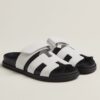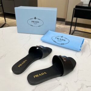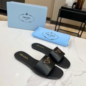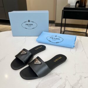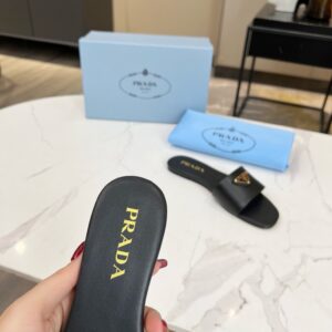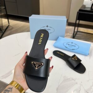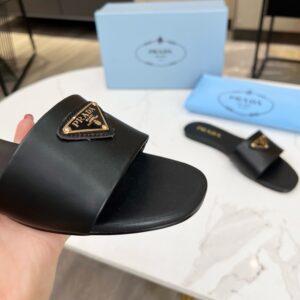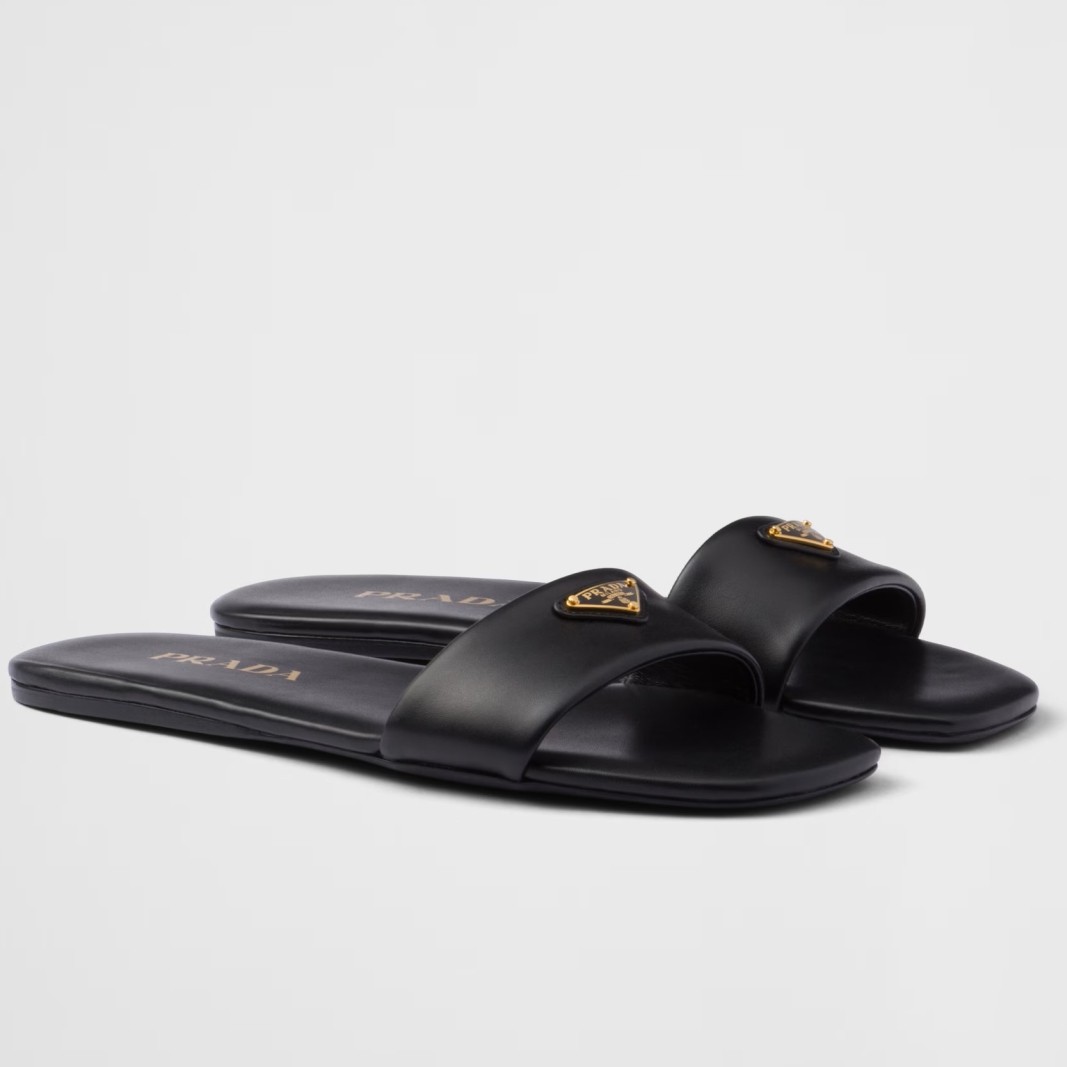 These flat slides with a sleek, contemporary design have a refined, versatile style. The flat, sleek leather silhouette with a square toe is completed by the iconic signature of the enameled metal triangle logo.