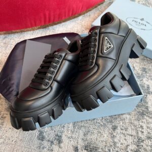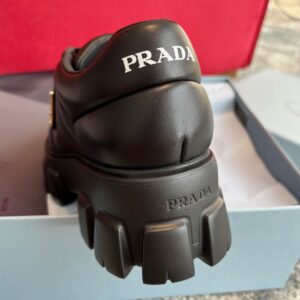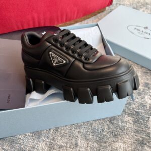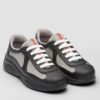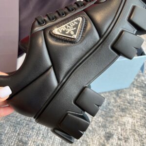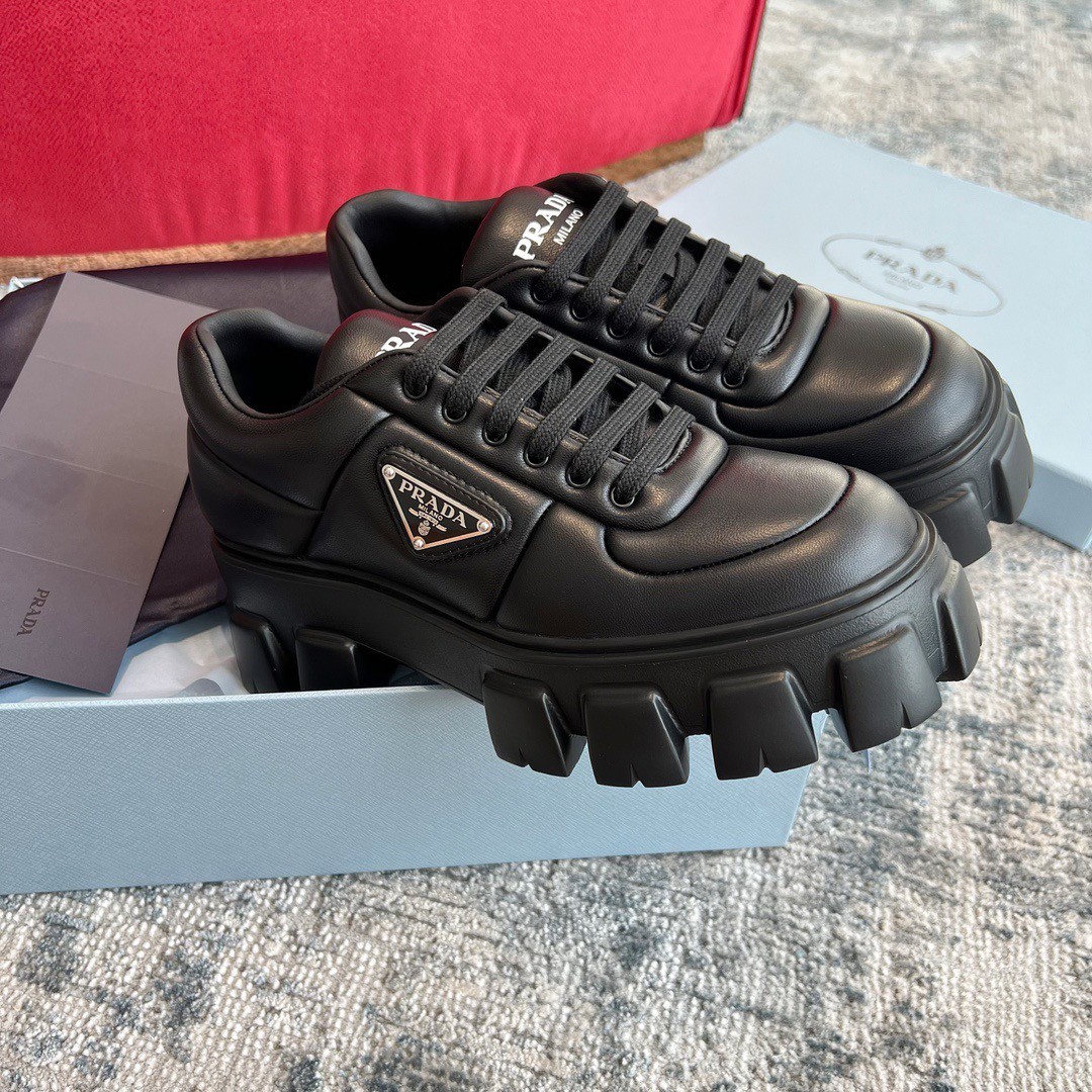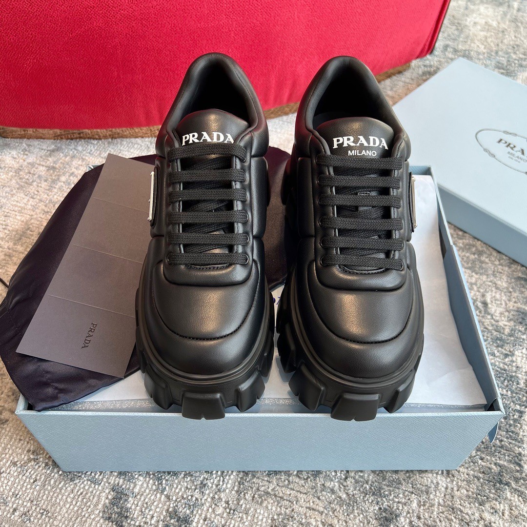 Soft proportions animate these light, minimalist sneakers with a sporty design. The padded nappa leather upper features decorative stitching and volumes that add a dynamic touch to the silhouette. The lettering logo on the tongue and the enameled metal triangle logo on the sides embellish the shoe with contemporary charm.
