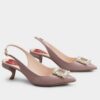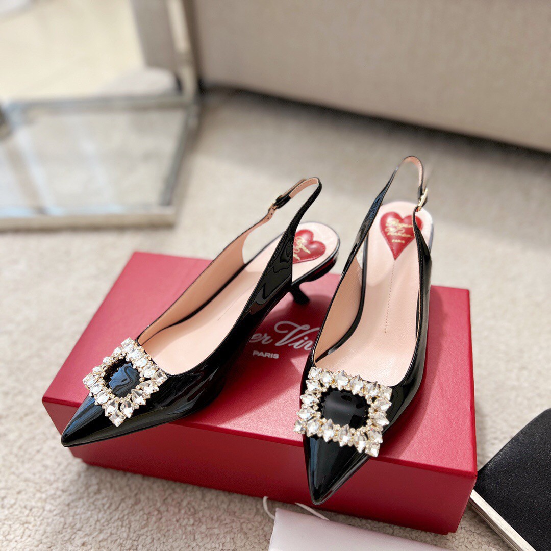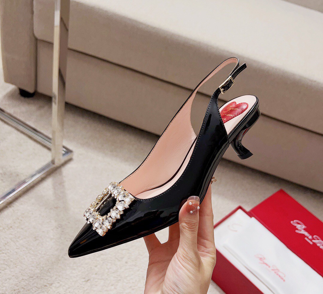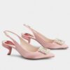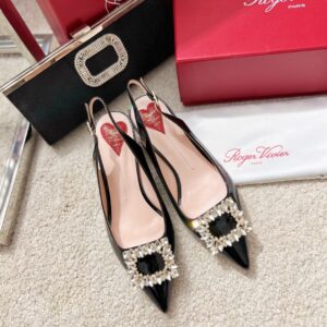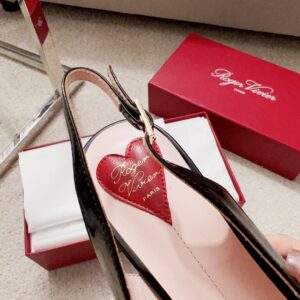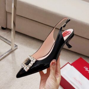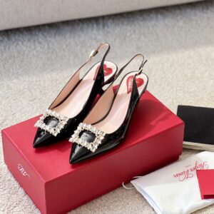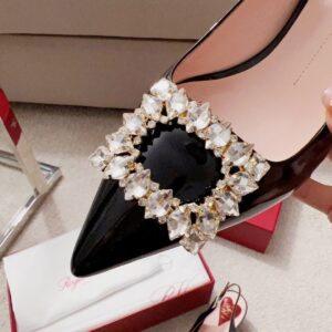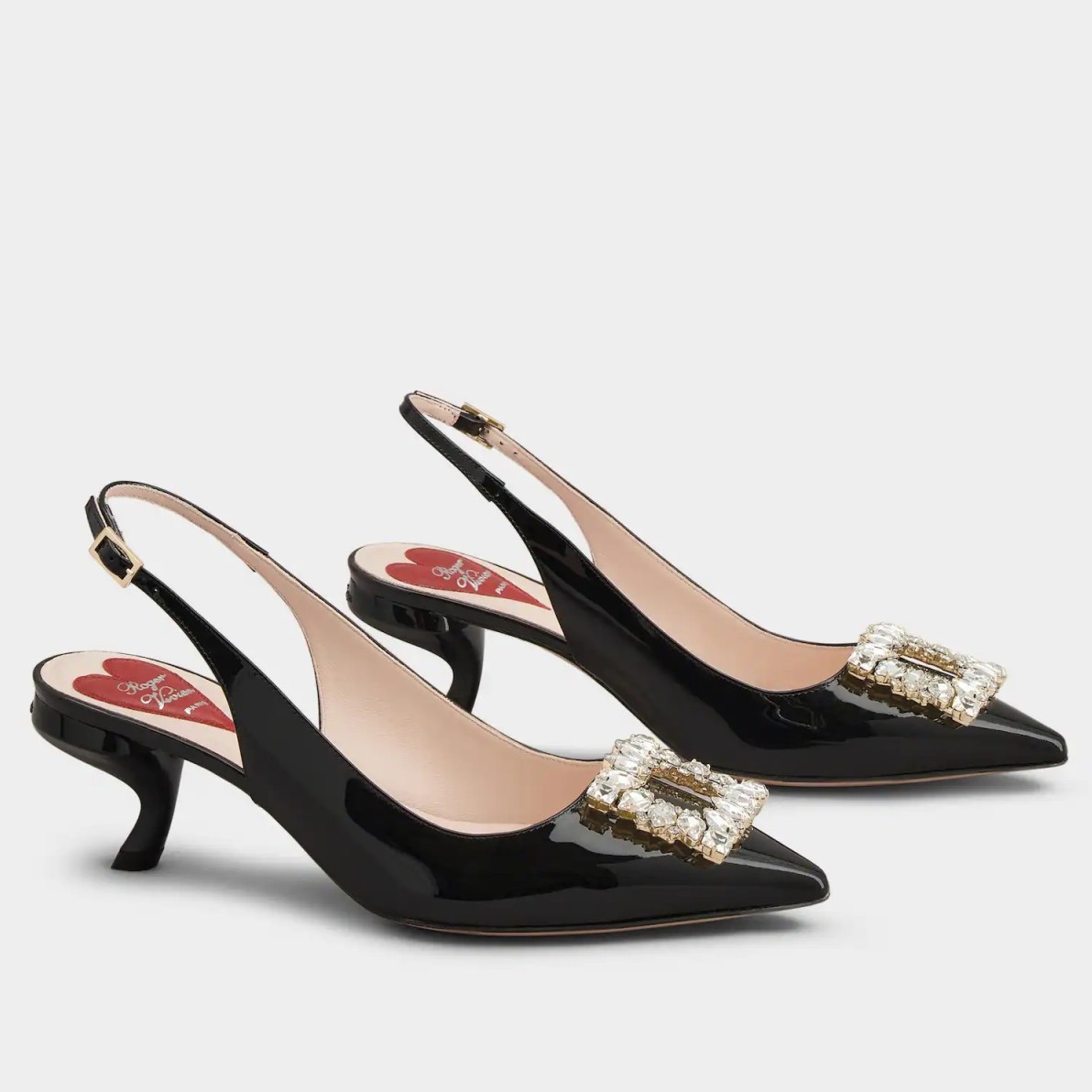 The 1963 Virgule heel, of the homonymous shape, is one of Monsieur Vivier’s most famous creations. This emblem of the Maison is the signature element of the Virgule Slingback Pumps. Crafted in patent leather, this version is enhanched with by the new buckle inspired by the creative director Gherardo Felloni’s garden. Composed of crystals in different sizes, this enchanting buckle with a floral shape features elements recalling the shape of a lemon.