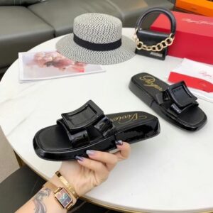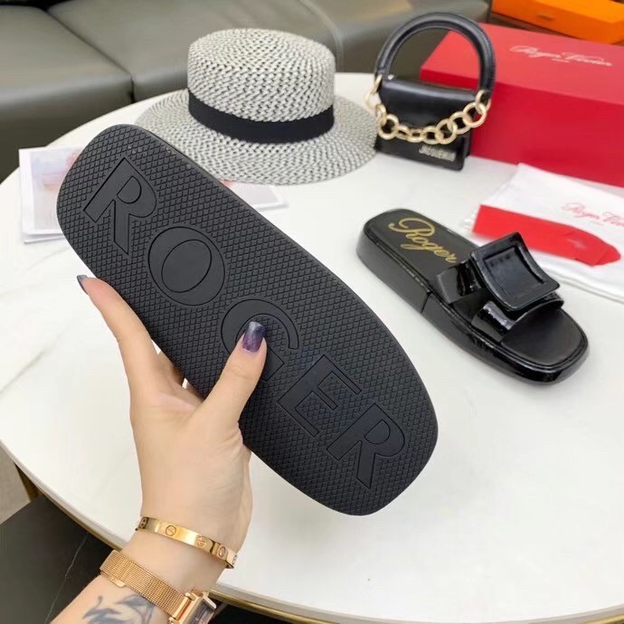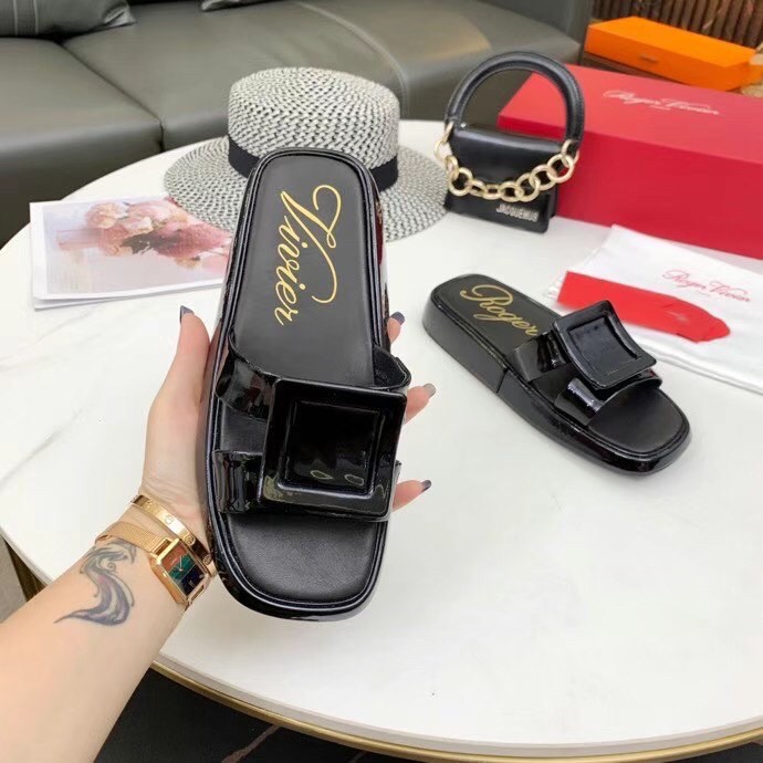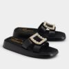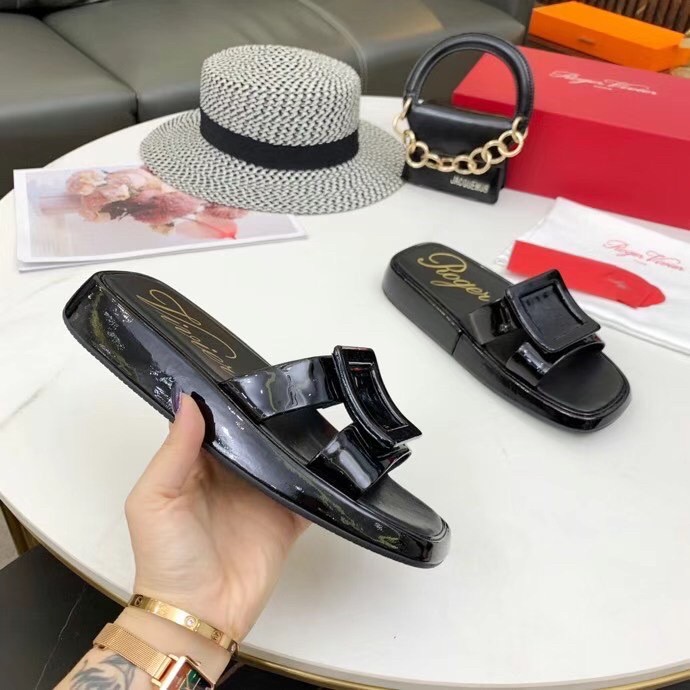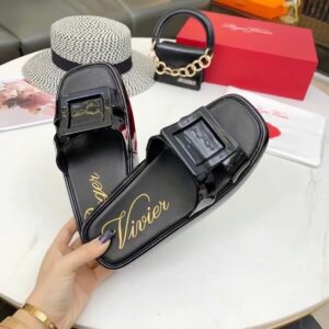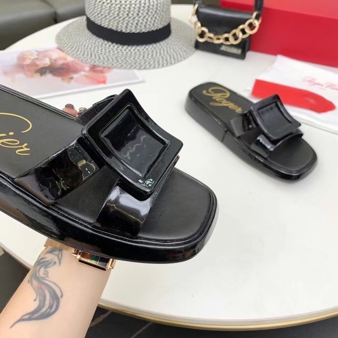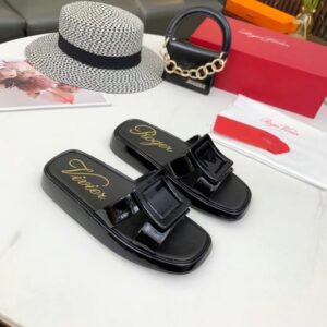 Roger Vivier updates a house signature – oversized square buckles – in contemporary fashion with these Vivier Slide sandals in tone-on-tone black. The slip-on pair are made from patent leather with matching painted hardware and elevated rubber soles.