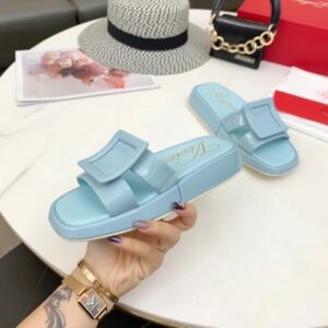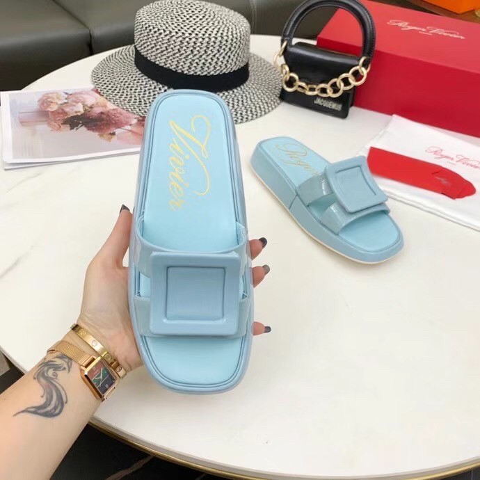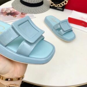 Roger Vivier updates a house signature – oversized square buckles – in contemporary fashion with these Vivier Slide sandals in tone-on-tone blue. The slip-on pair are made from patent leather with matching painted hardware and elevated rubber soles.