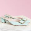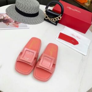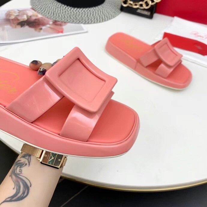 Roger Vivier updates a house signature – oversized square buckles – in contemporary fashion with these Vivier Slide sandals in tone-on-tone pink. The slip-on pair are made from patent leather with matching painted hardware and elevated rubber soles.