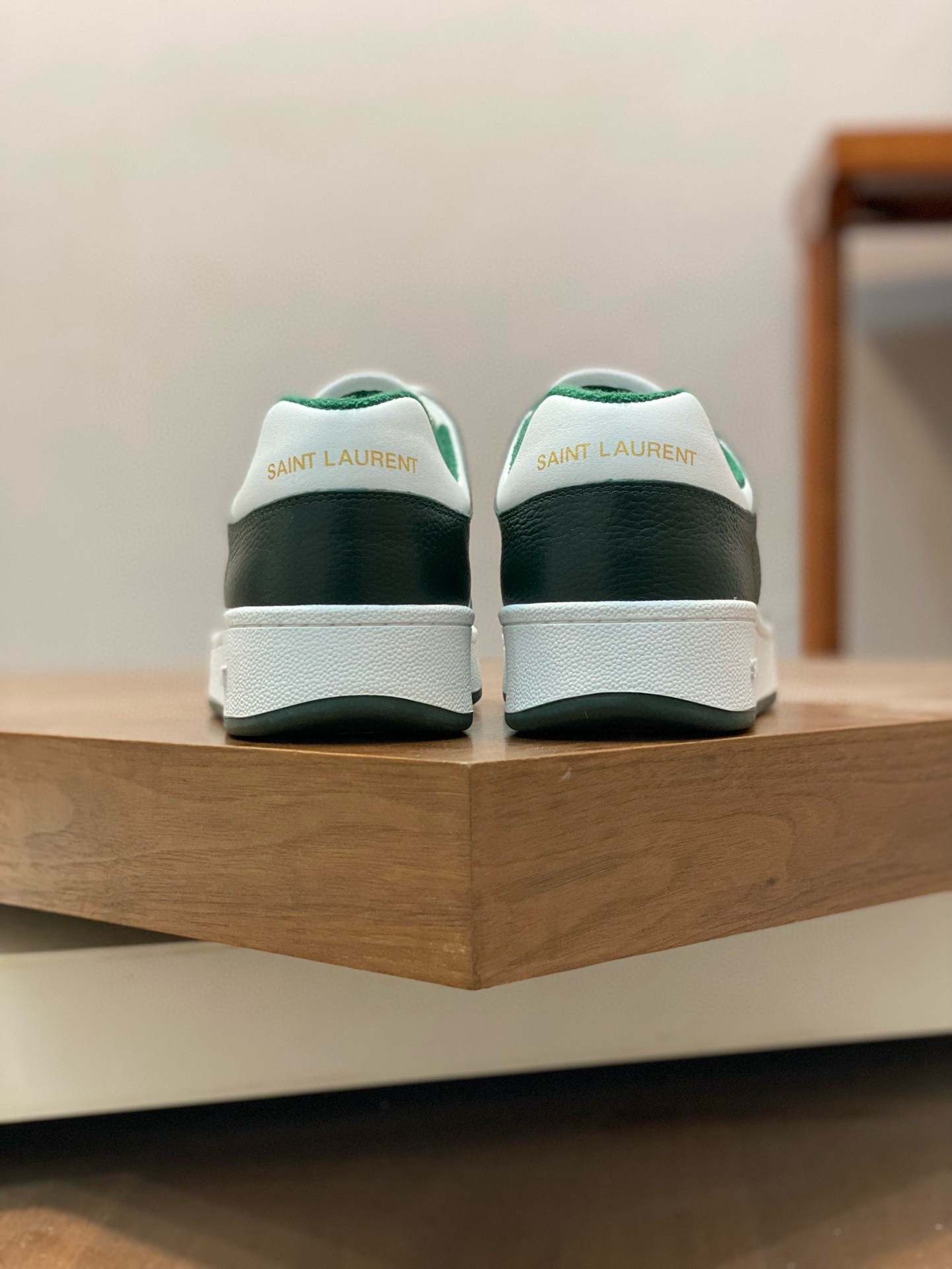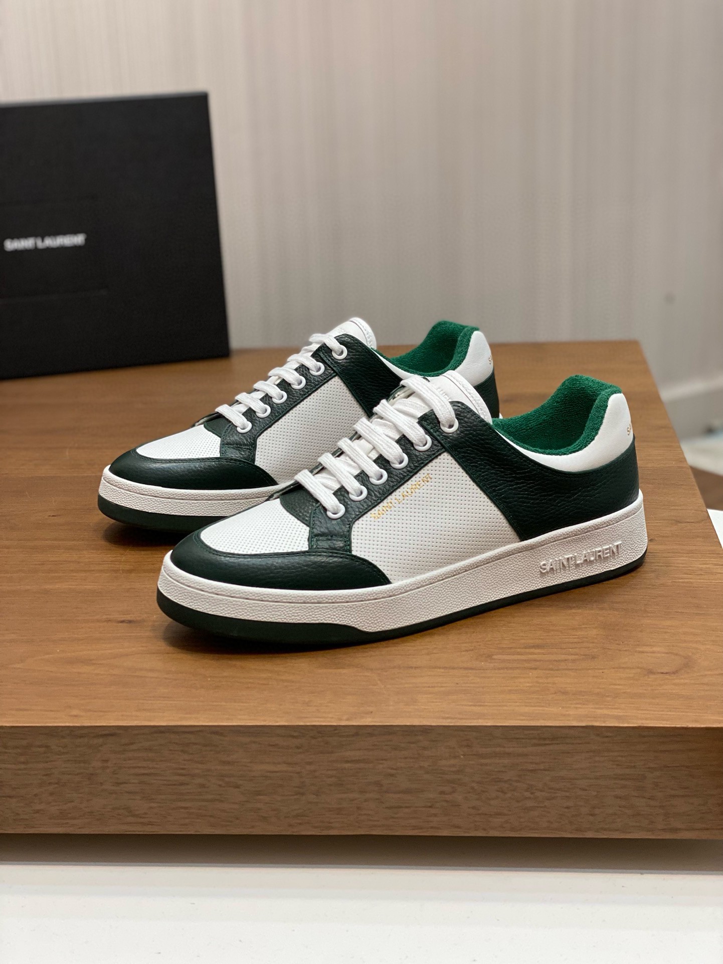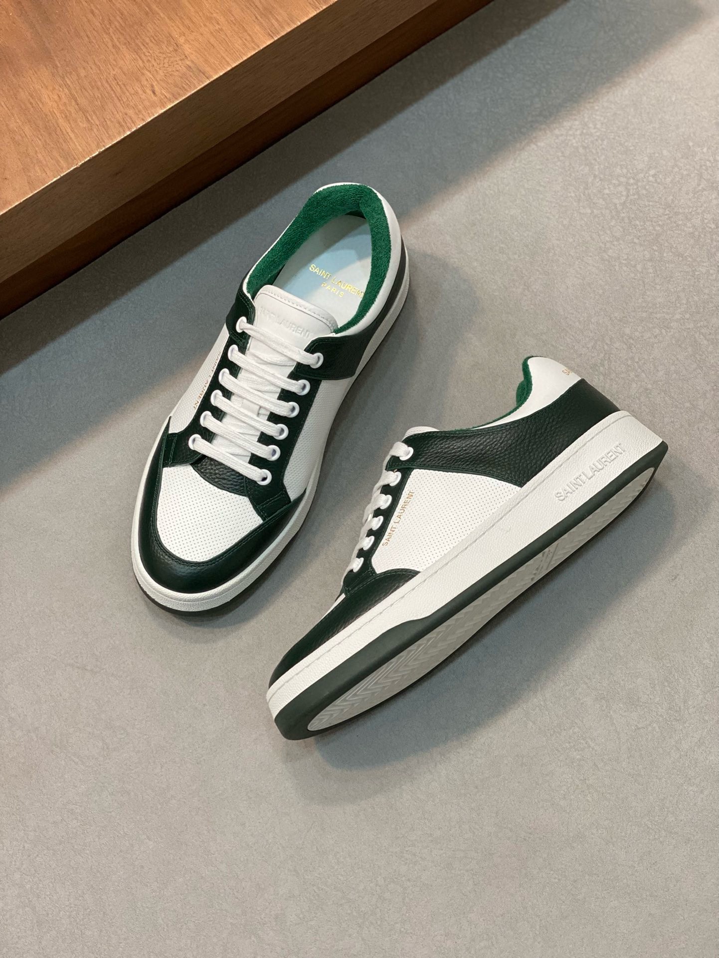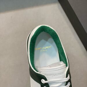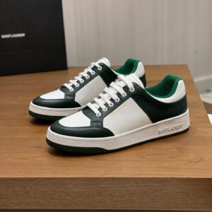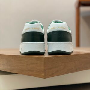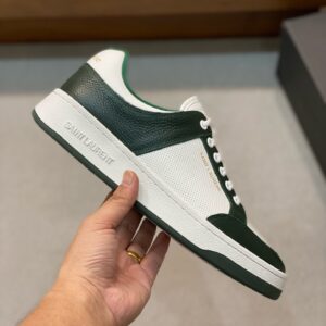 SAINT LAURENT’s SL61 sneakers have been made from supple white leather that’s perforated at the sides and toe box to enhance breathability. They’re paneled with green for a striking contrast and stamped with the brand’s moniker in gold on the heel tab and sides.