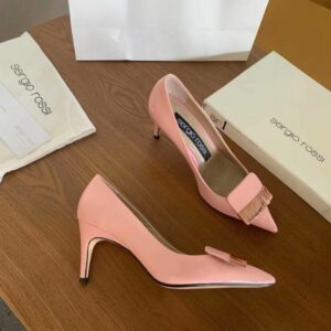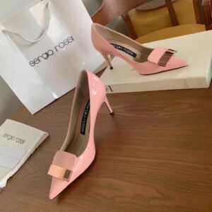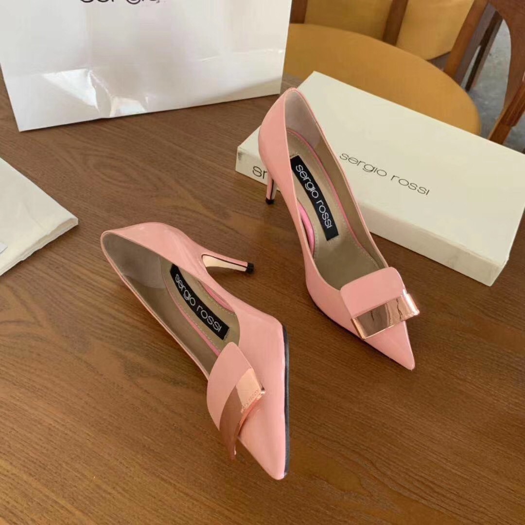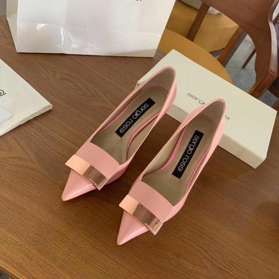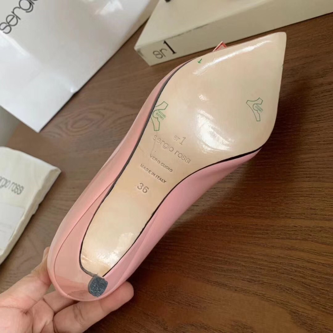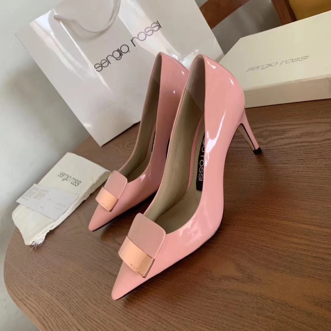 These pointed sr1 pumps with a midi-heel in glossy patent leather flaunt minimalist style. The iconic and distinctive gold-tone metal plate will add some extra shine to contemporary outfits.