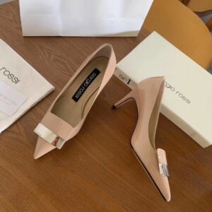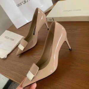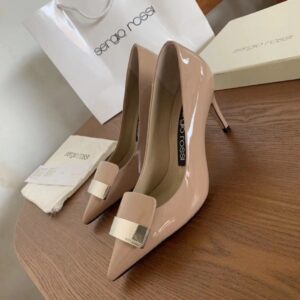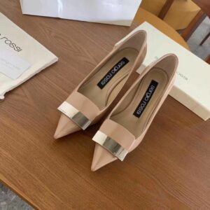 These pointed sr1 pumps with a midi-heel in glossy patent leather flaunt minimalist style. The iconic and distinctive silver-tone metal plate will add some extra shine to contemporary outfits.