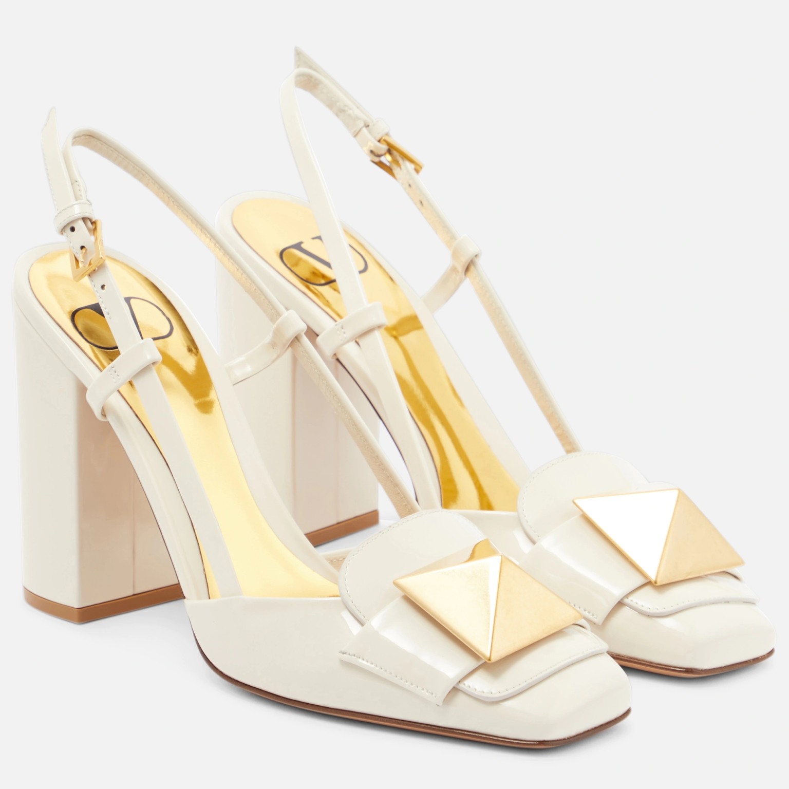 Signature ‘Rockstud’ hardware features on so many of Valentino Garavani’s accessories and on these patent-leather slingback pumps, the embellishment has been blown up to statement proportions. They’re set on a stable block heel and have tabs at the squared toes reminiscent of loafers. The classic antique-rose shade will go with endless outfits.