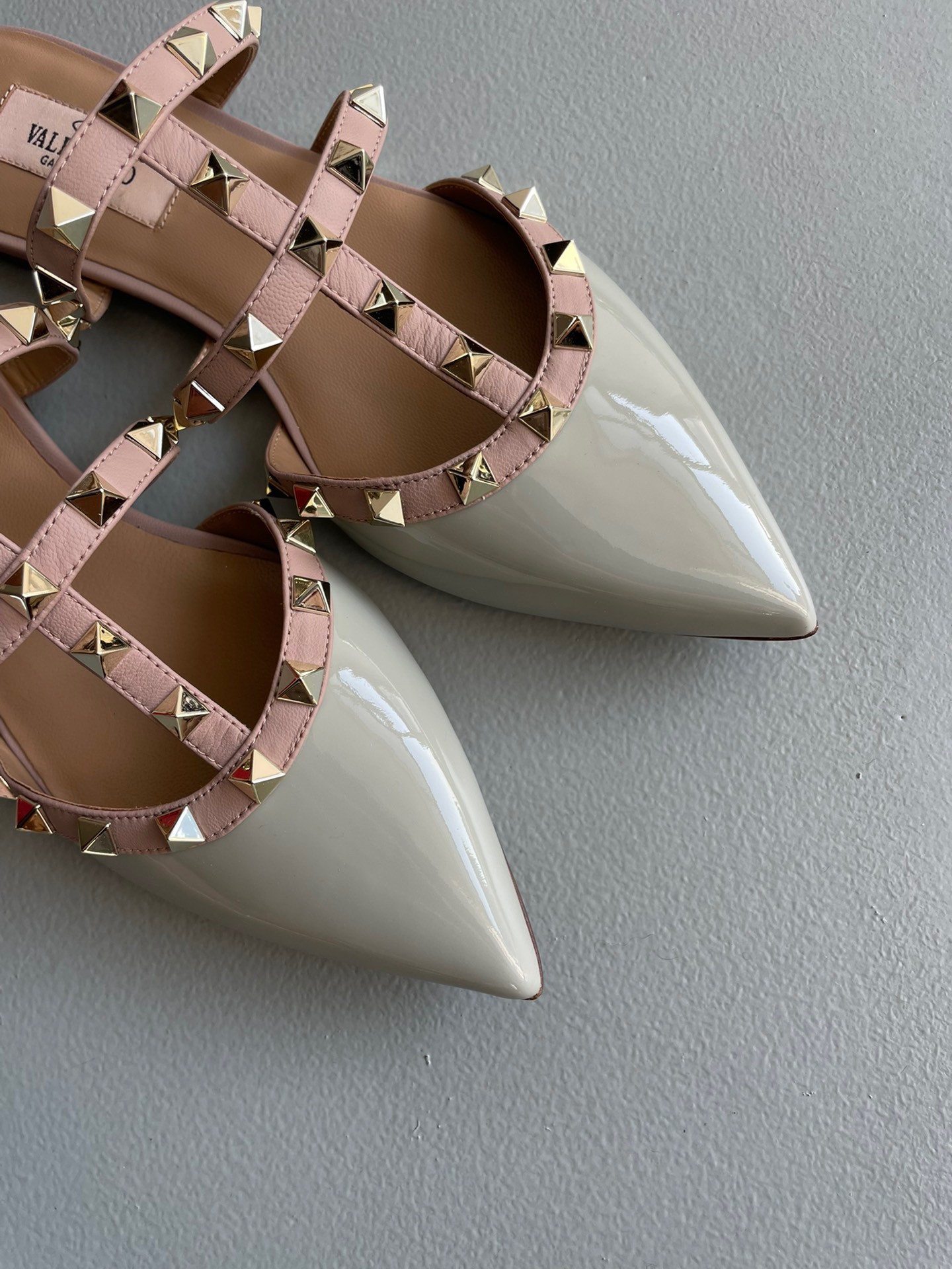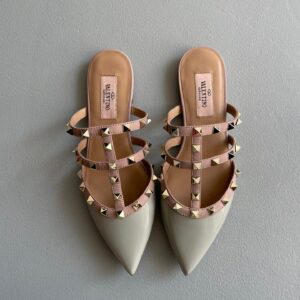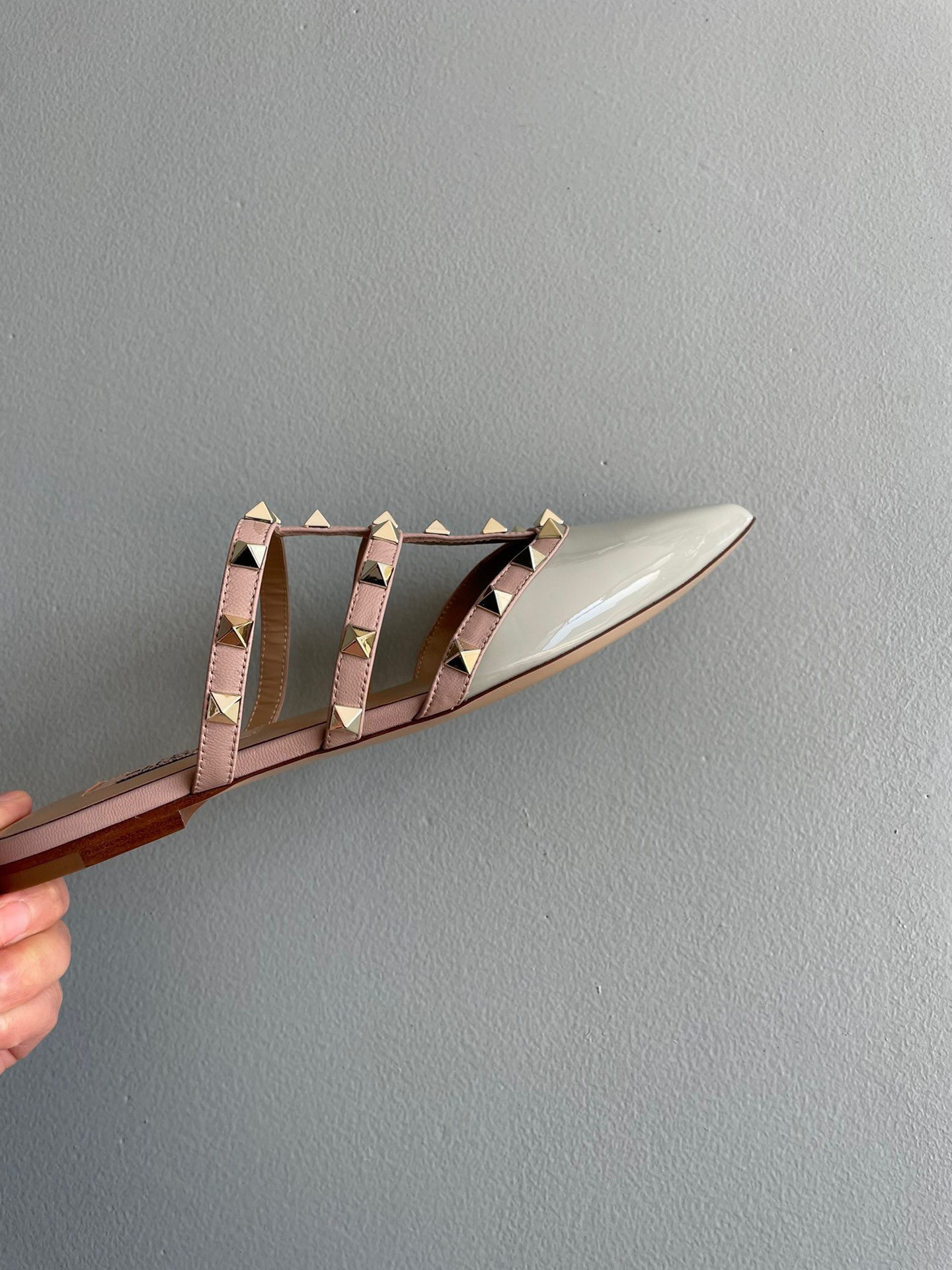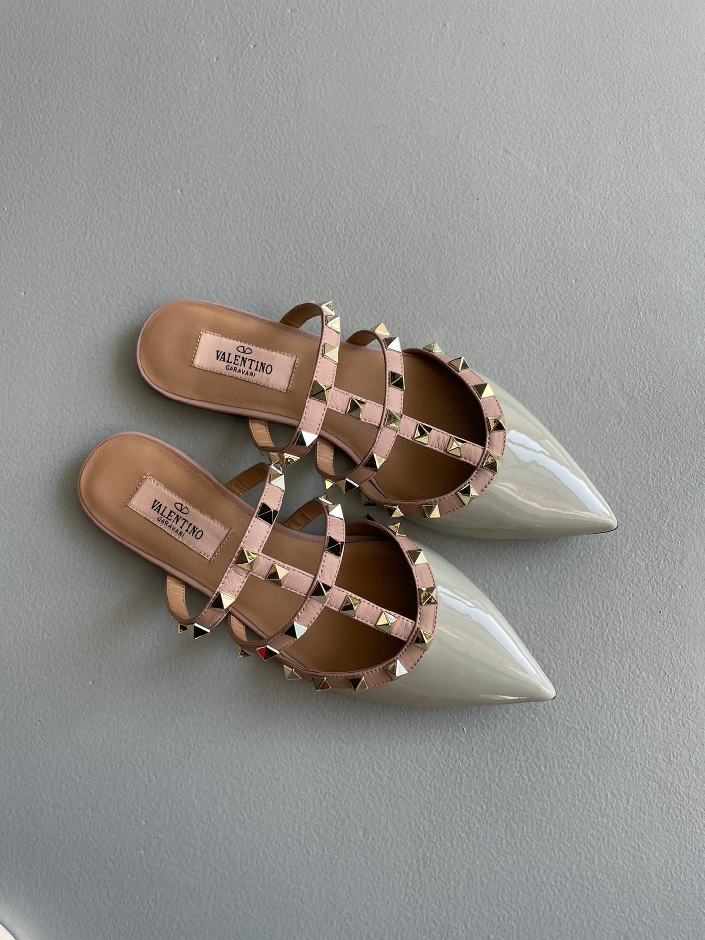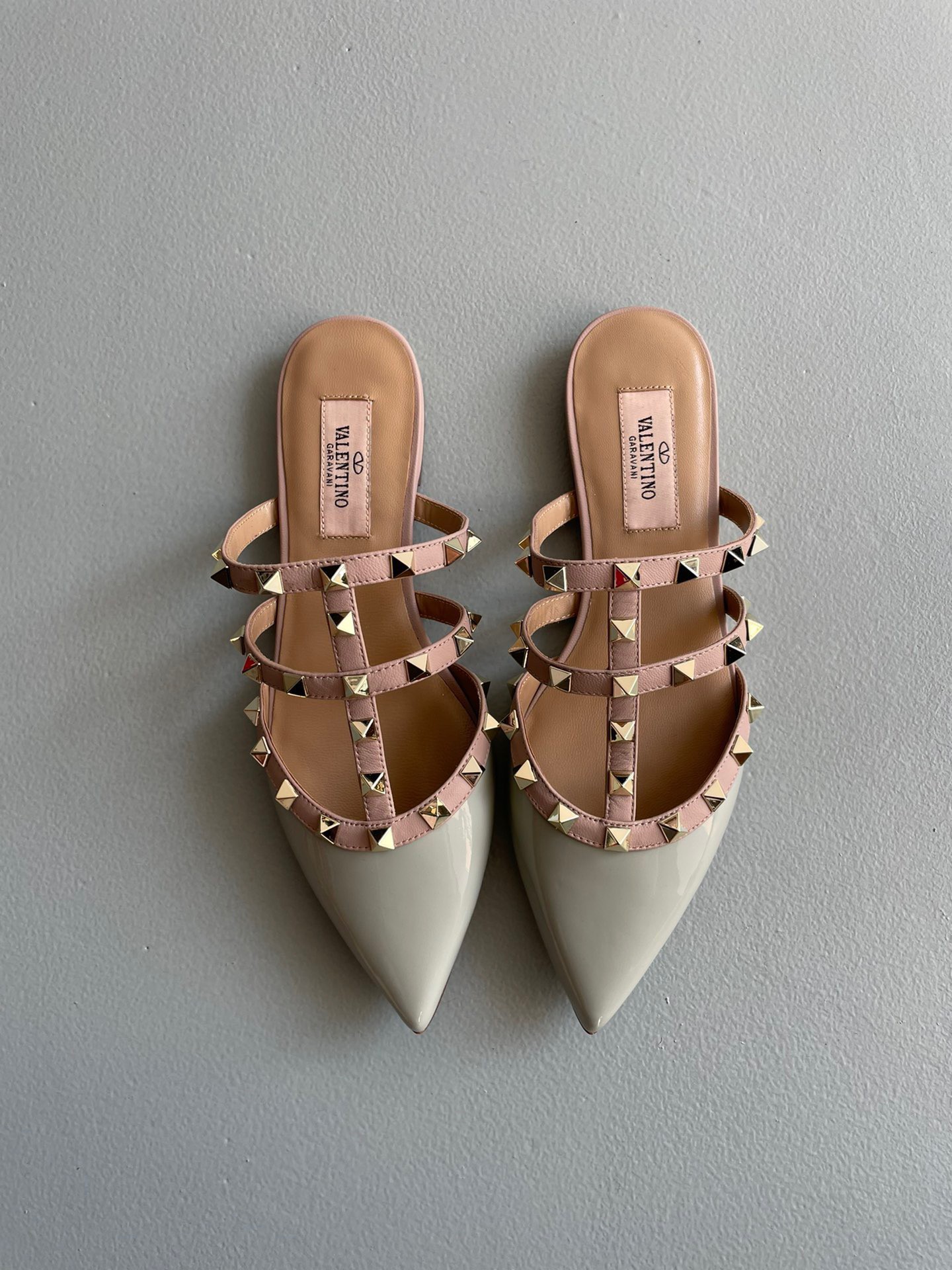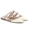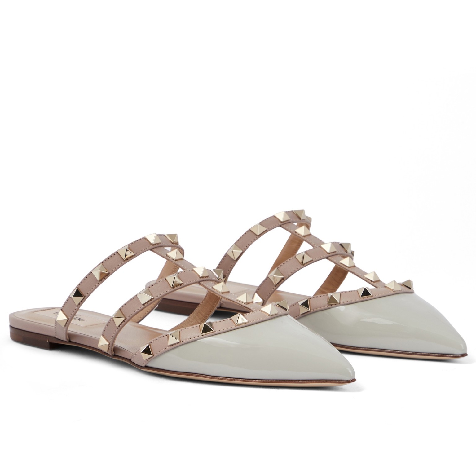 Valentino Rockstud Flat Mules In Opal-grey Patent Leather