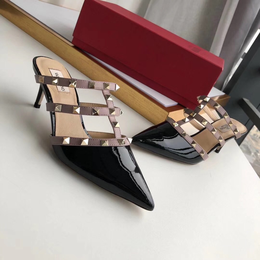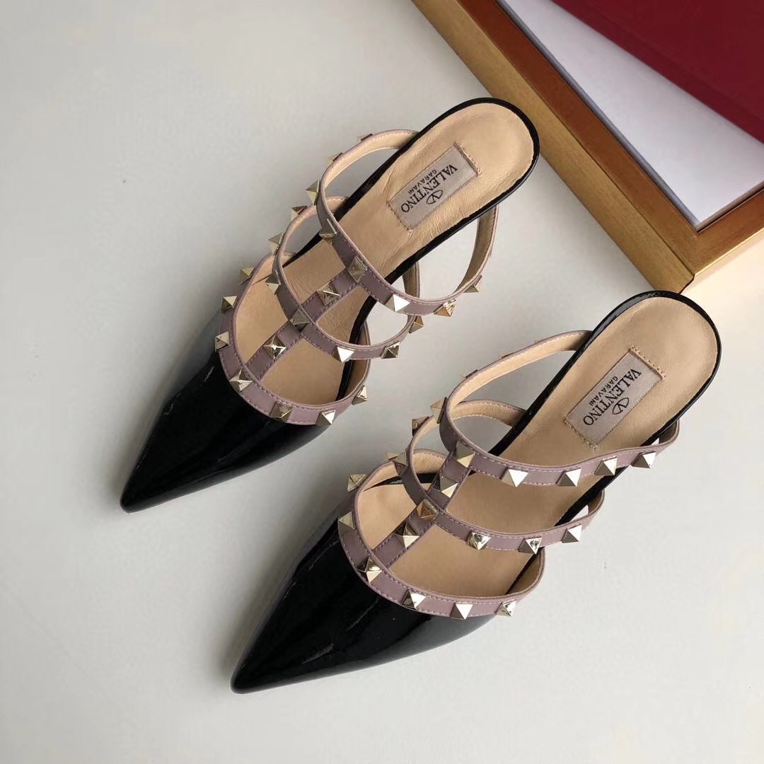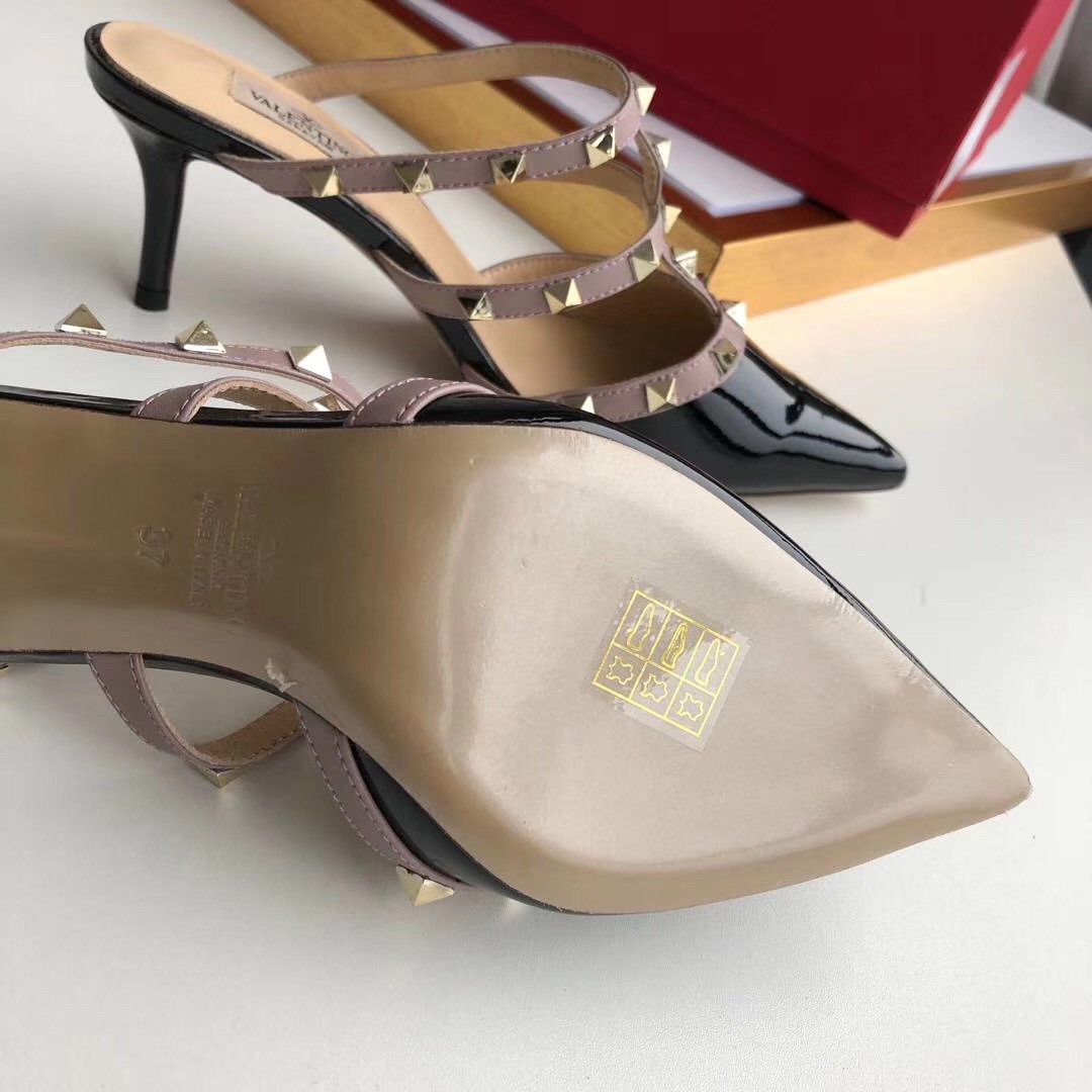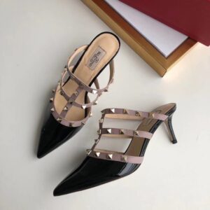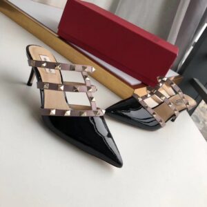 Let Valentino Garavani’s Rockstud mules add a tough-luxe look to your shoe rotation. The glossy patent leather design was made in Italy and molded to a point-toe silhouette set on sleek kitten heels. Taupe-hued contrast straps lend a caged effect and show off the label’s signature golden pyramid studs.