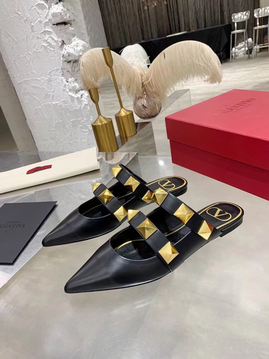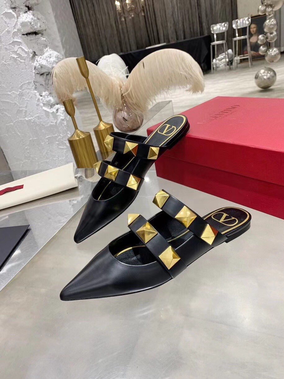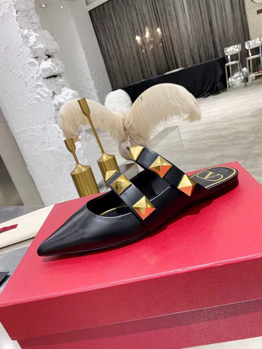 Valentino Roman Stud Flat Mules In Black Leather