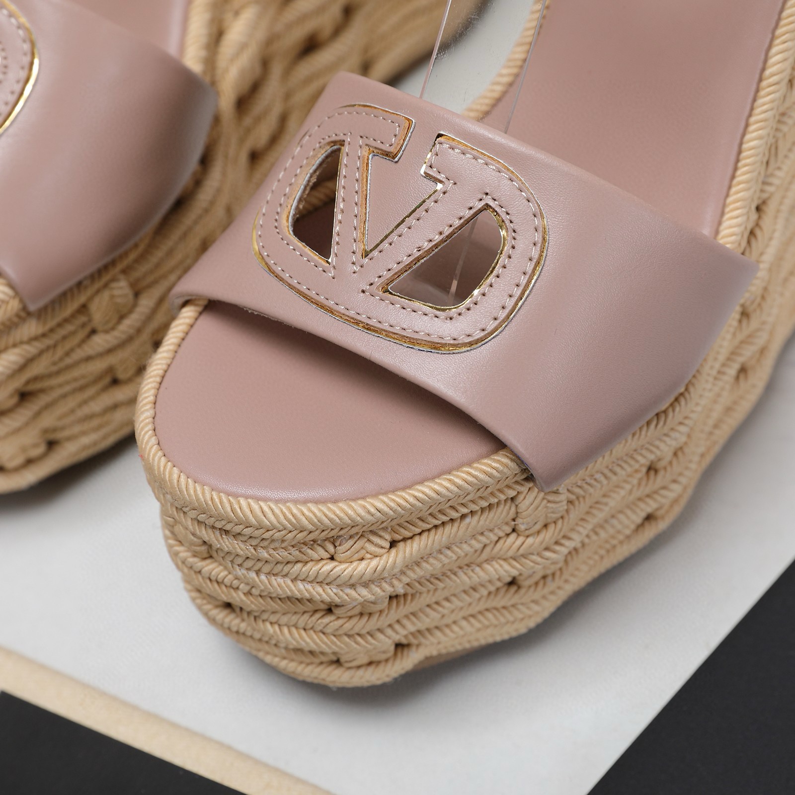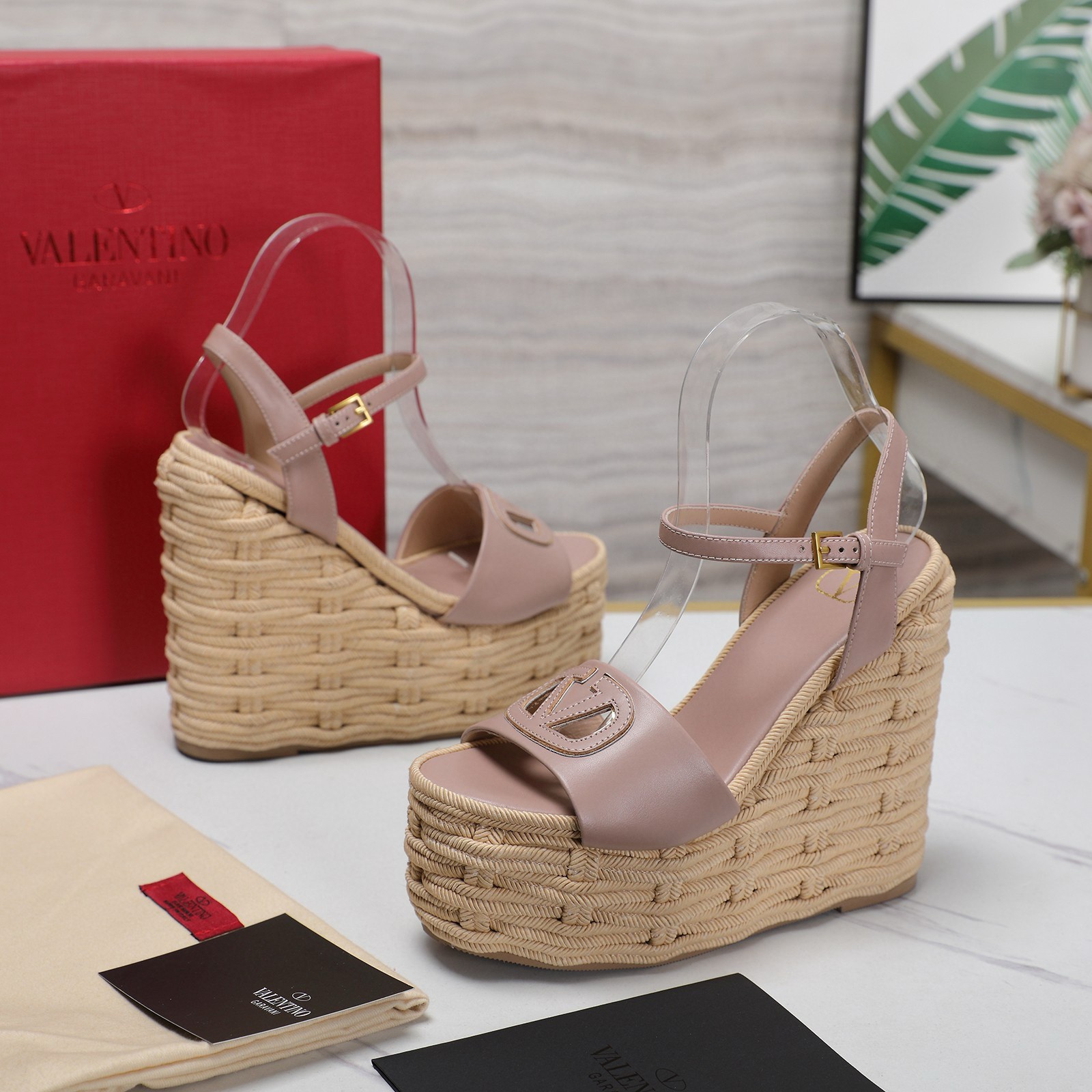 Valentino VLogo Cut-out Espadrille Wedge Sandals in Beige Leather