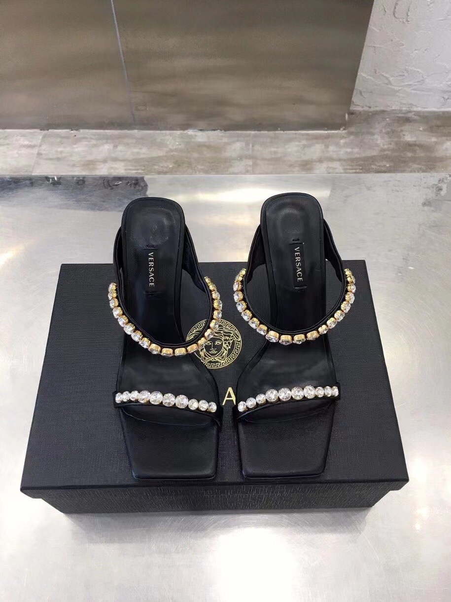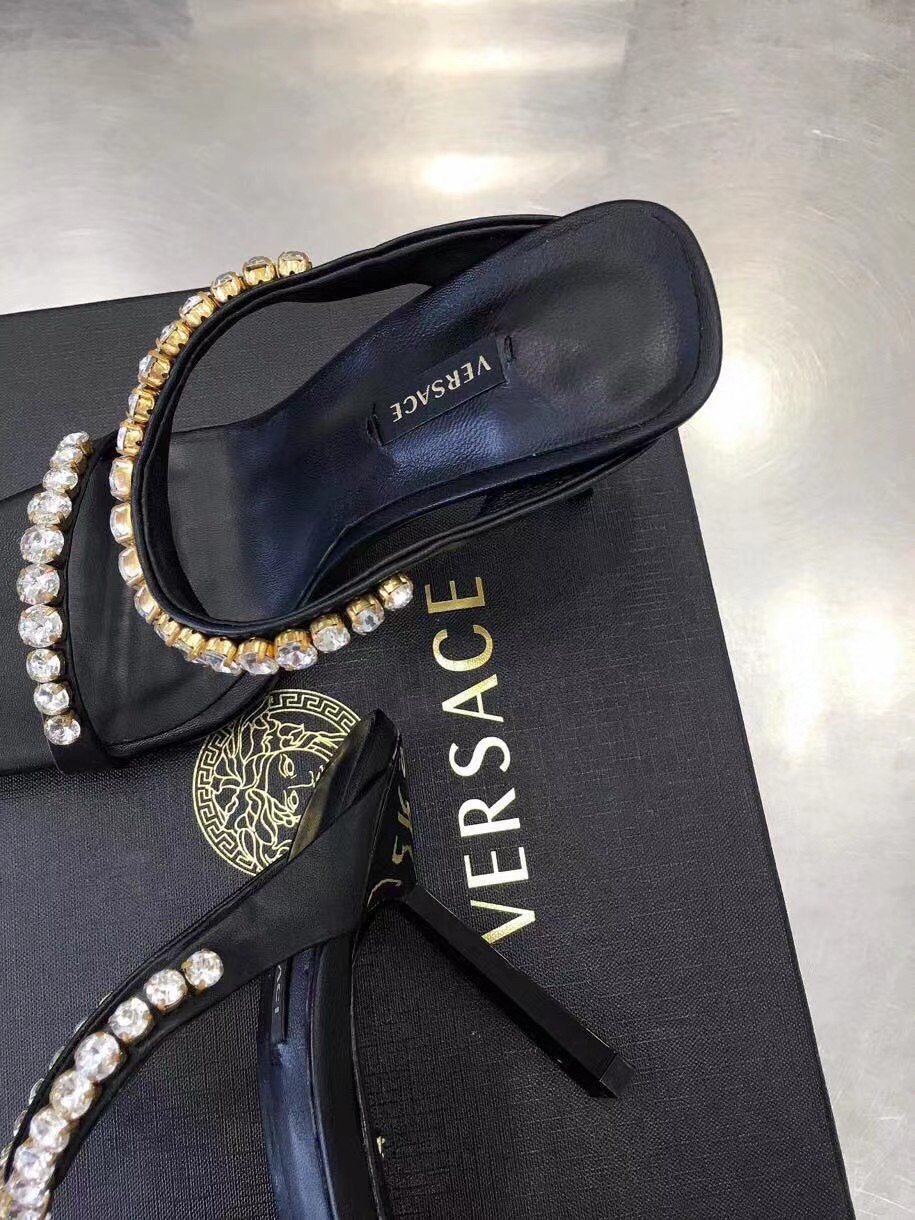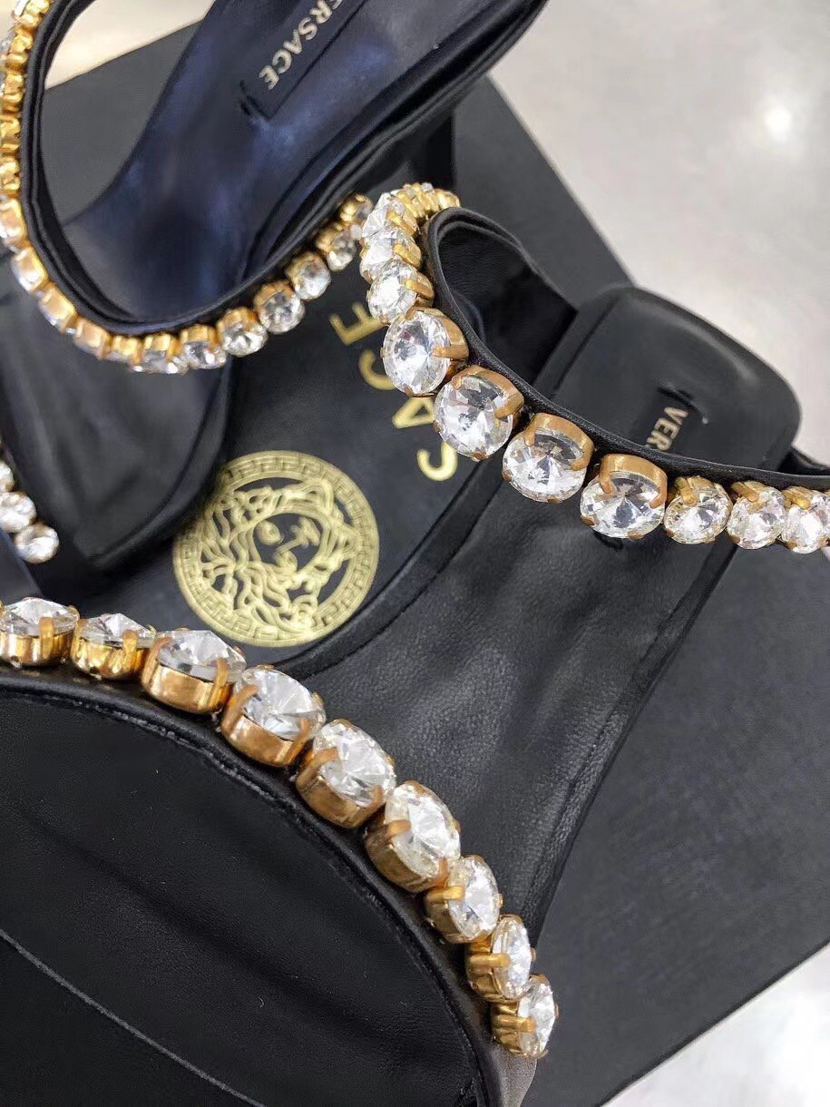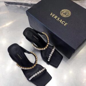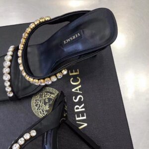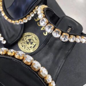 Add a statement piece to your outfit with the Versace Rhinestone Mules. Designed in a bold colour-block silhouette, these high heel shoes detail a square toe with rhinestones to the ankle and toe strap in a tonal colourway. Pair with a satin maxi dress for a complete evening occasion look.