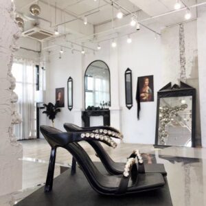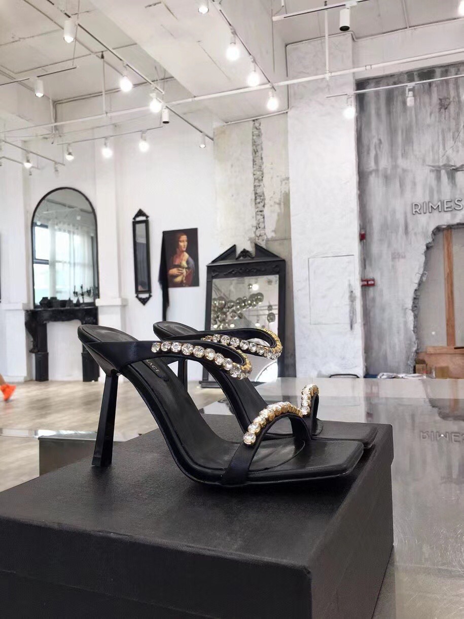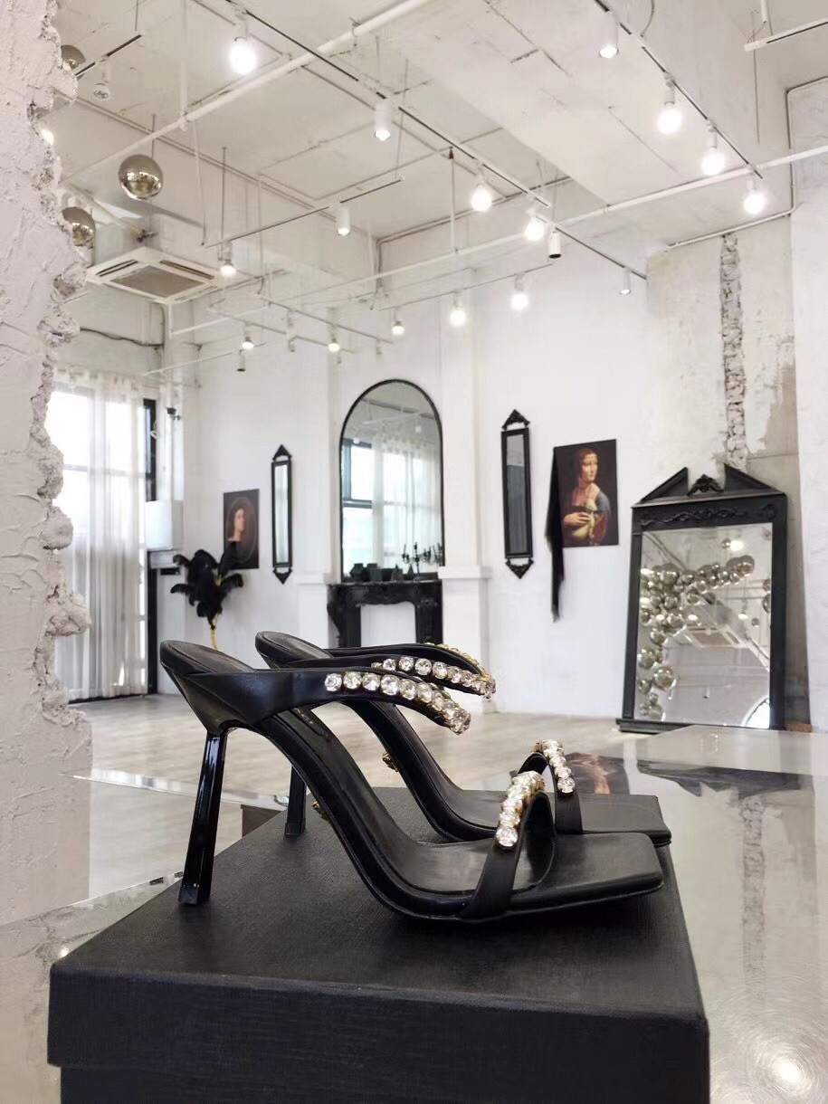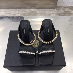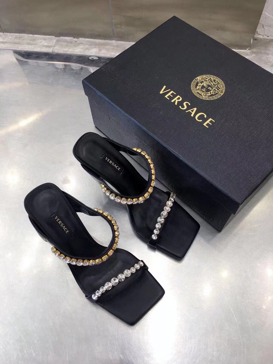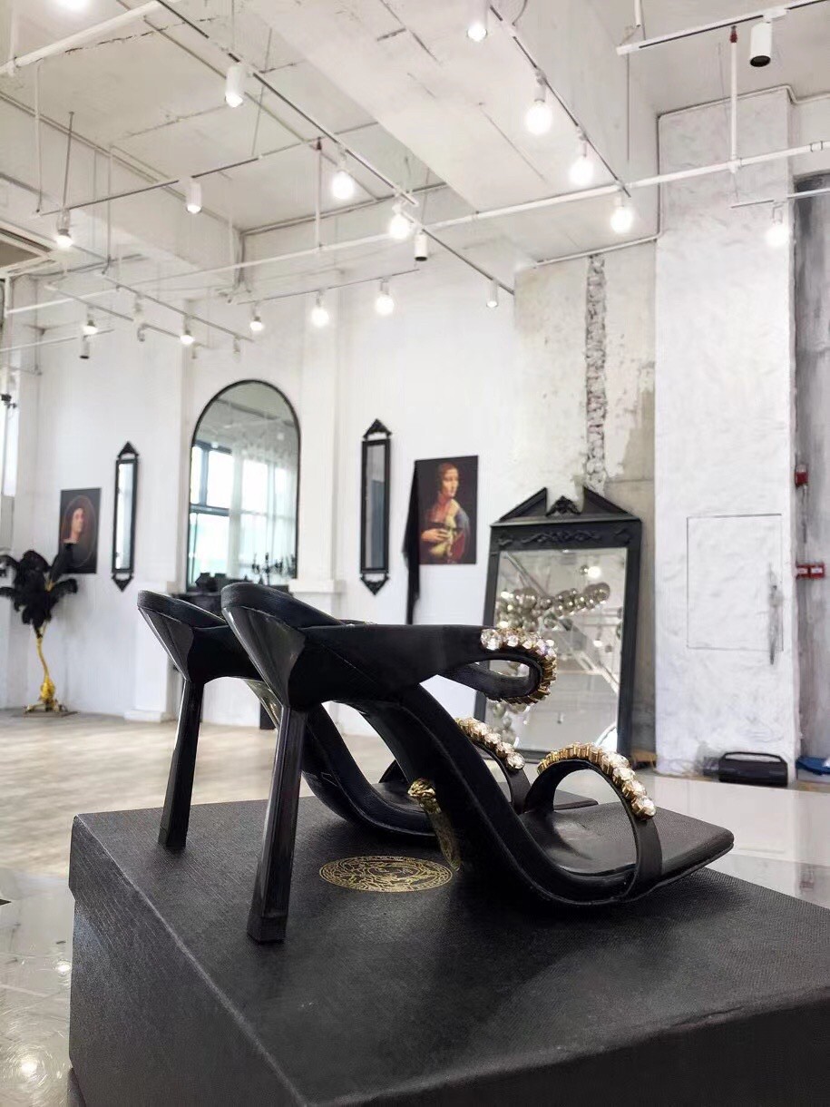 Add a statement piece to your outfit with the Versace Rhinestone Mules. Designed in a bold colour-block silhouette, these high heel shoes detail a square toe with rhinestones to the ankle and toe strap in a tonal colourway. Pair with a satin maxi dress for a complete evening occasion look.