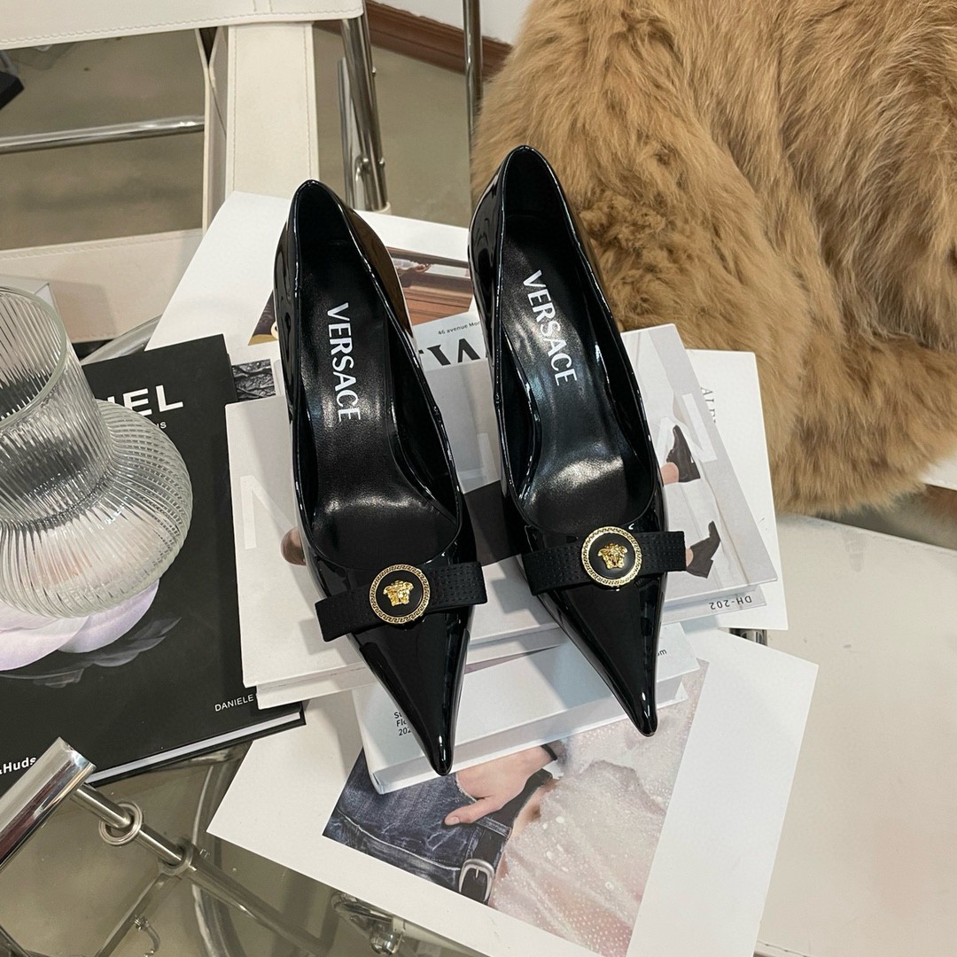 These Versace point-toe pumps are decorated with the Nastro Gianni bow and Medusa plaque hardware at the front. They’re sculpted from glossy leather and set atop towering stiletto heels.