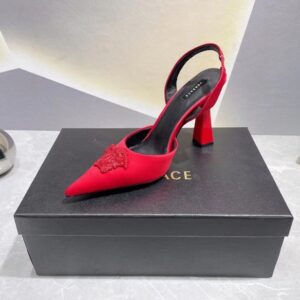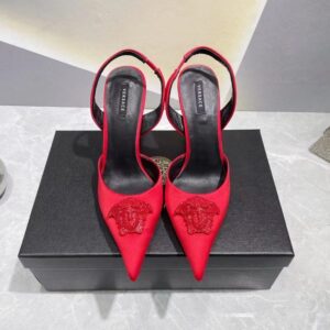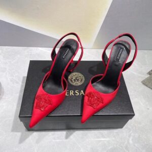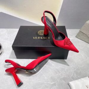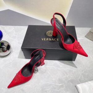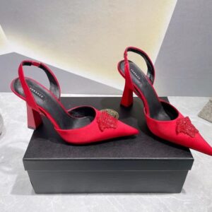 Effortlessly elegant, these slingbacks are crafted from smooth satin. The sleek pointed toe silhouette is adorned with a fully crystal-encrusted Medusa plaque – the iconic décor found on the doors of the brand’s first headquarters in Milan.