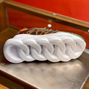 Echoing Versace’s extravagant aesthetic, the Chain Reaction sneaker perfectly embodies the strongest elements of the Italian fashion house’s identity. Arriving in an eclectic design, the chunky sneakers boast a leopard-print upper, contrasted by garish red overlays and a translucent midfoot cage. Complete with braille ‘love’ lettering, the unique style nods to the idea that love is blind.