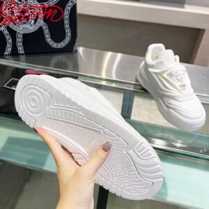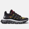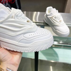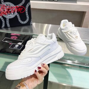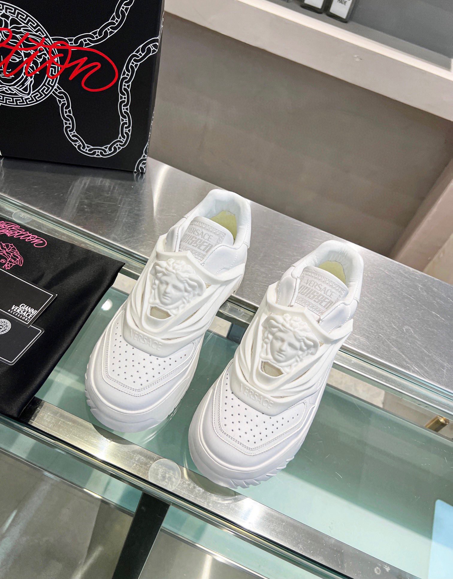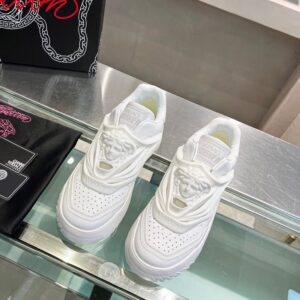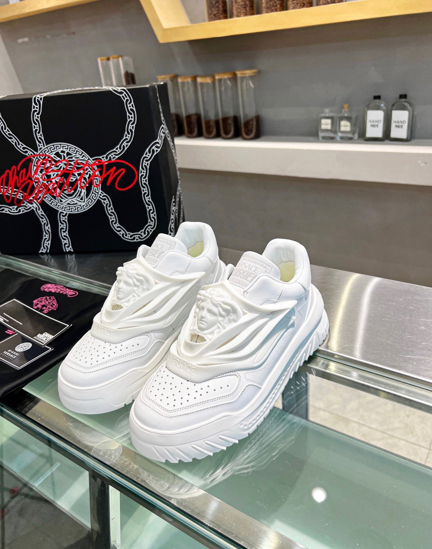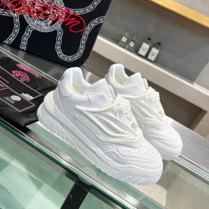Designed by Versace’s in-house team, the shoe is comprised of a sleek leather upper with futuristic design elements and a multi-layer composition. A rounded toe with a perforated toe box leads the top of the sneaker to a 3D rubber lace guard that features an enlarged, laser-cut “Medusa” plaque. The tongue incorporates a fabric label tag with the “Versace” and “Odissea” font logo branding.